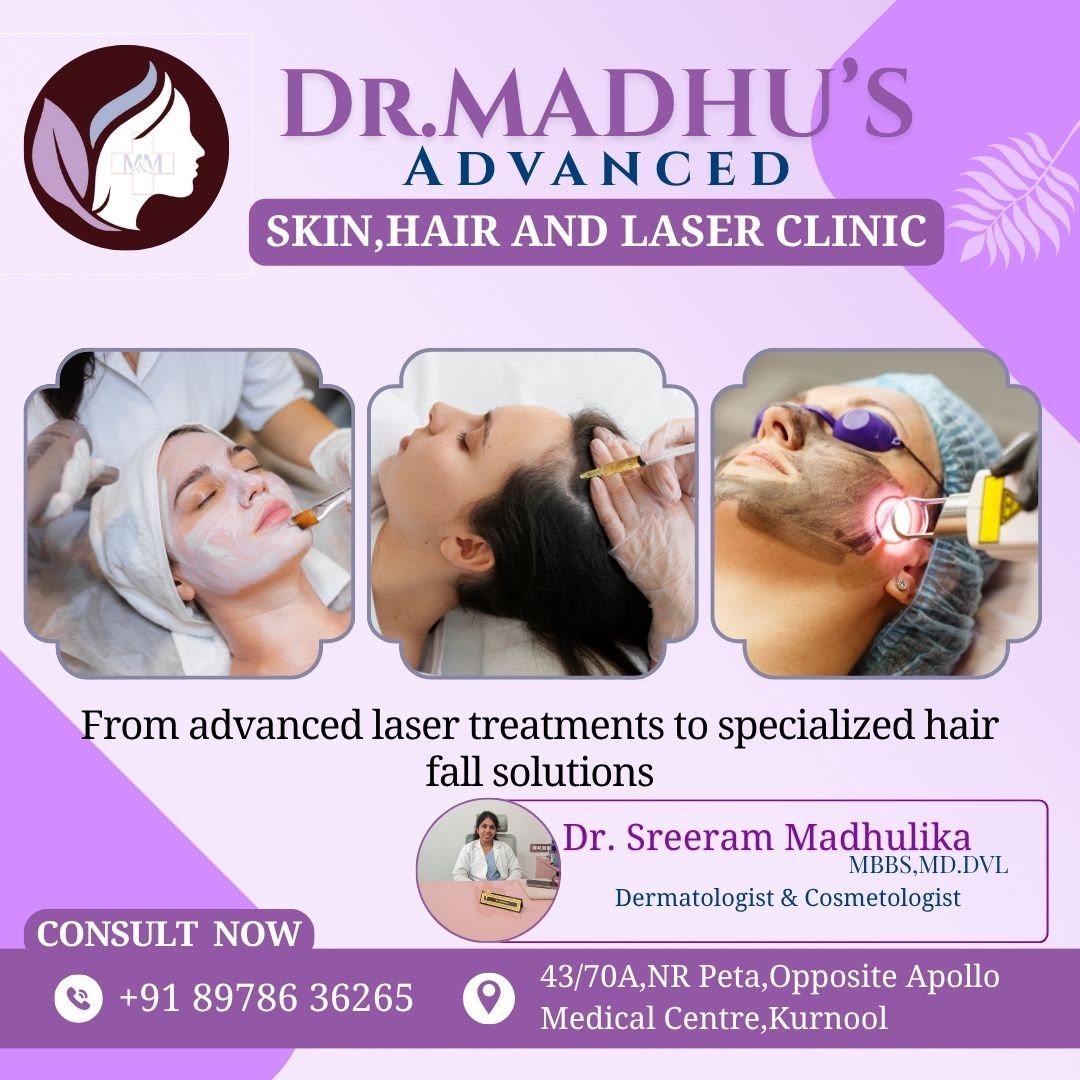 Find expert care for all your dermatological and cosmetic needs at Dr. Madhu’s Advanced Skin, Hair and Laser Clinic in Kurnool. Led by the highly qualified Dr. Sreeram Madhulika, this clinic provides a comprehensive range of advanced treatments for skin, hair, and nails.