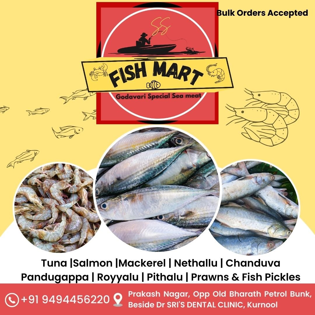 Welcome to SS Fish Mart, your ultimate destination for fresh, healthy, and hygienic seafood right here in Kurnool. We specialize in bringing the authentic taste of Godavari Special Sea Meat straight to your kitchen. Whether you are craving a daily seafood meal or planning a grand feast, we guarantee top-quality, freshly sourced catches every time.