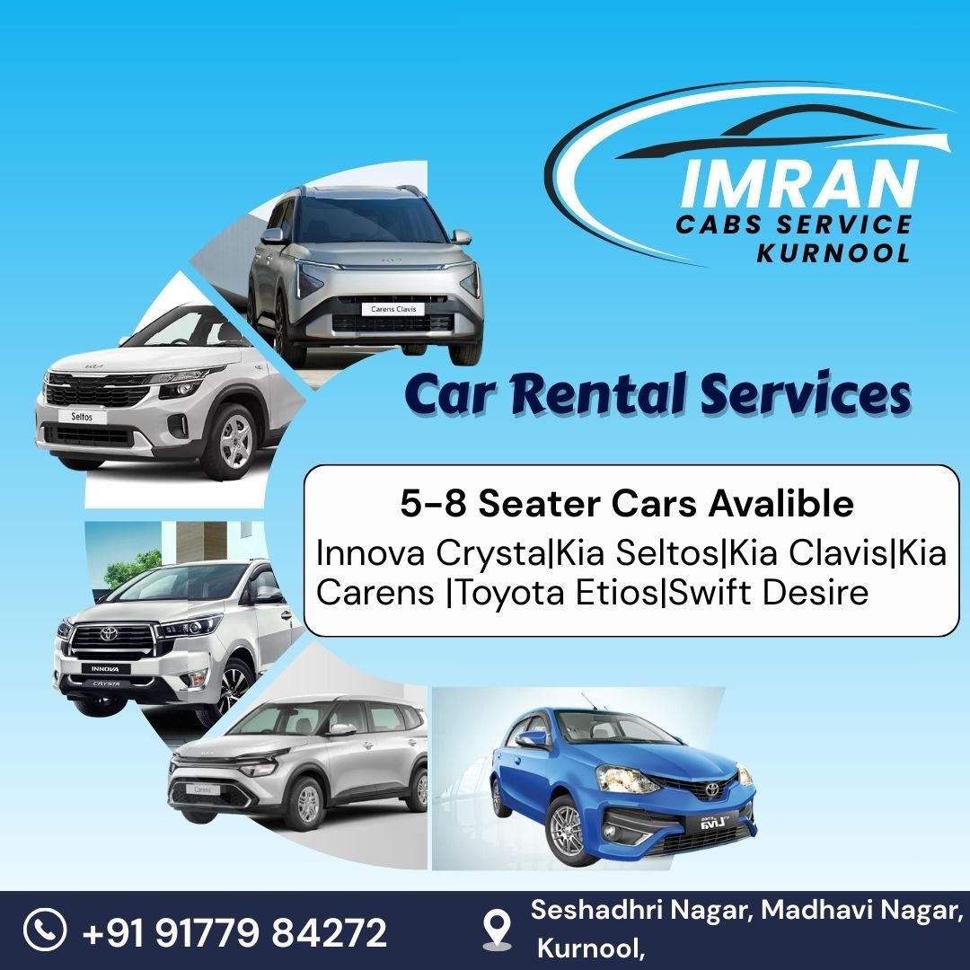 Imran Cabs Service Kurnool is your trusted partner for reliable, comfortable, and affordable transportation in and around Kurnool. Whether you need a quick city transfer or a long-distance outstation journey, we provide a premium fleet of well-maintained 5 to 8-seater vehicles to suit every travel need.