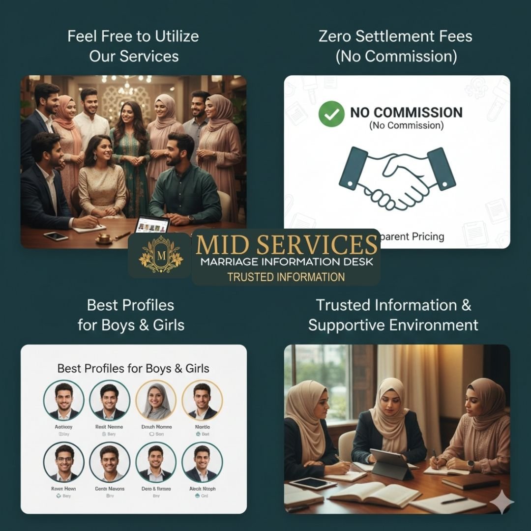 Feel free to utilize the trusted match-making services at MID Services. We offer access to the Best Profiles for Boys & Girls within a Supporting Environment, and guarantee No Settlement Fees (Commission), ensuring a transparent and successful search for your life partner.