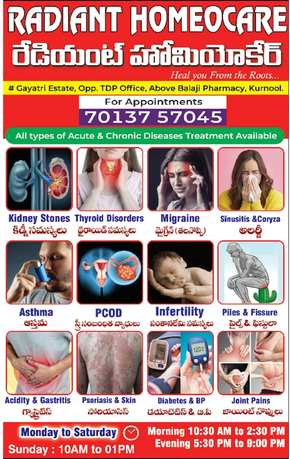 - Radiant Homeocare, Shop No.3, Above Durga Pharmacy, Gayatri Estate, Opp. TDP Party Office, Kurnool.