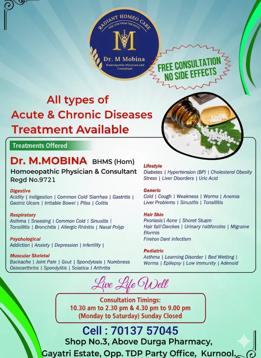 Are you searching for a trusted Homeopathy Clinic in Kurnool that offers natural, lasting relief from chronic diseases? Look no further than Radiant Homeocare, led by the experienced Dr. M. Mobina (BHMS, Hom). We specialize in “healing you from the roots,” providing holistic and effective homeopathic treatment for a wide range of acute and chronic health conditions.