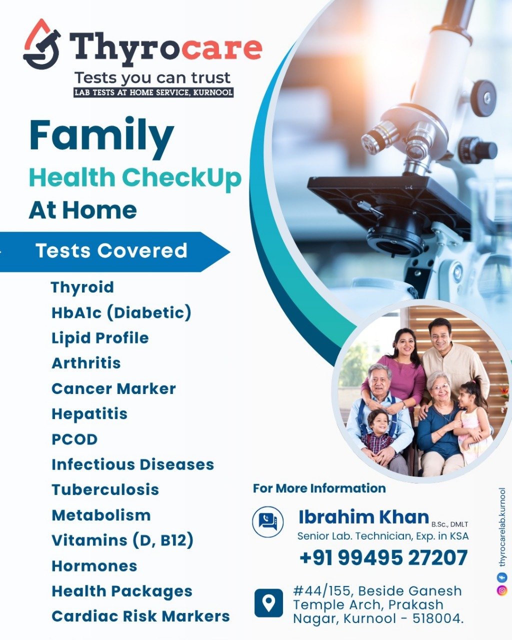 Led by Mr. Ibrahim Khan (B.Sc., DMLT), a senior lab technician with experience in KSA, the Thyrocare team in Kurnool is dedicated to providing professional and hygienic sample collection from your home. Now, you can prioritize your health with unparalleled convenience.
