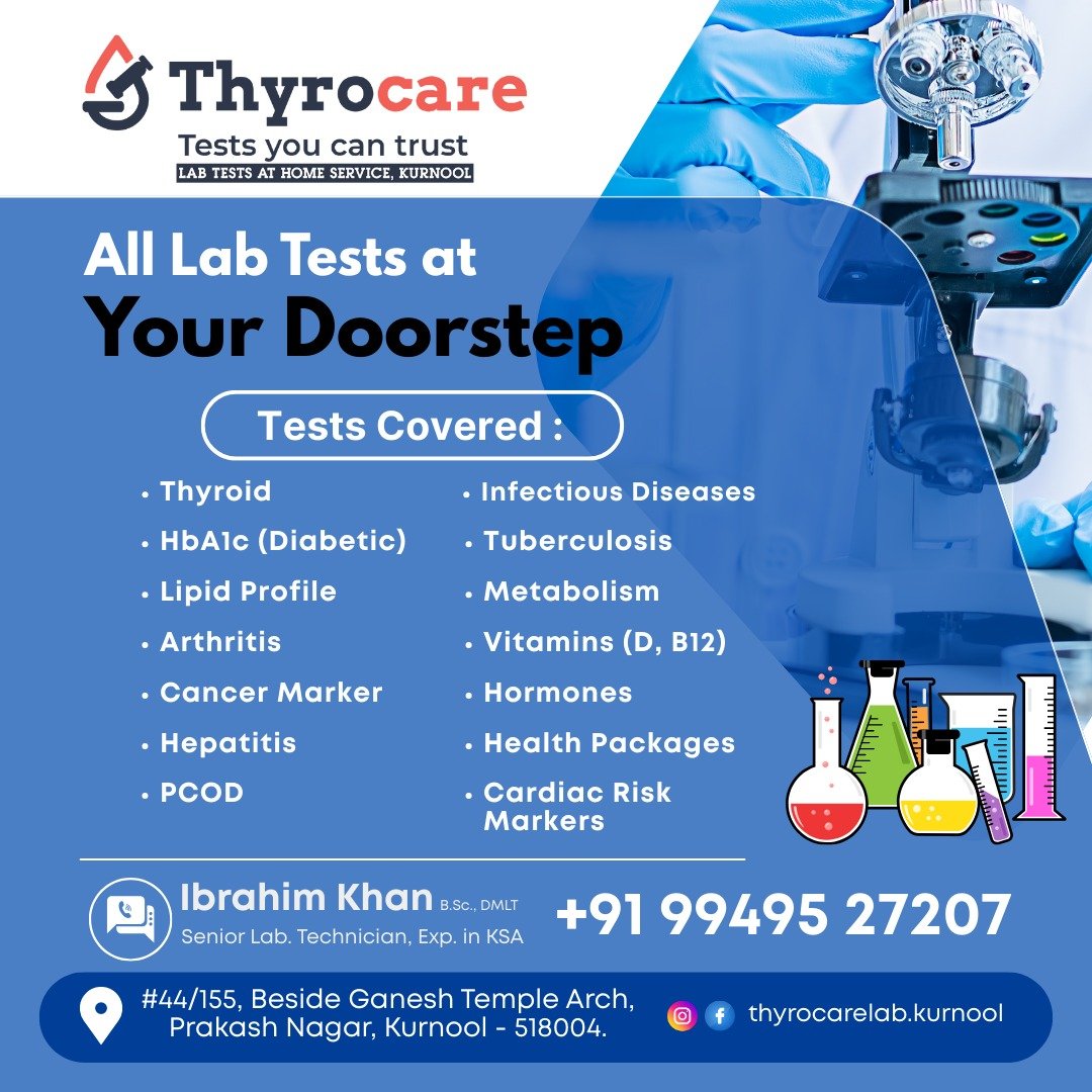 Good news for Kurnool residents! Thyrocare, one of India’s most trusted diagnostic brands, now offers at-home lab test services right here in our city.